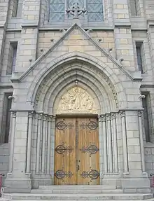 The tower, built of Brittany granite, is composed of a rectangular portion into which the portal opens and is surmounted by an open-work spire. The portal, with a tympanum representing the Apparition of our Lord, after His Resurrection, to St. Thomas the Apostle, and signed Louis Dupont, is surmounted by a three-light window with mullions and a tracery rose, in blue granite of Brittany.