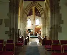 The north stub of the earlier late 13th-century transept contains a 15th-century Perpendicular window, with four lights divided by slender mullions ending in flat curved arches with trefoils, the centre two lights extending above to a pointed arch. The line of the previous 13th-century north transept is defined by a pointed relief moulding above. The south stub transept window is Early English, incorporating four lancet lights with three quatrefoil rosettes above.[1][12][13]