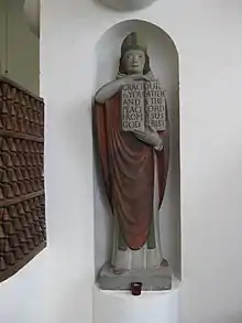 The site on Halton Hill was given by Viscount Halifax and the building was paid for by Sir John Priestman. The foundation stone was laid on 6 November 1937. The church is Grade II* listed.[1] It bridges the gap between the Arts and Crafts style and modernism. It has Early English gothic inspired details, such as the triangular-headed windows.[2] The concrete vaulting within the interior in Nikolaus Pevsner's words "remind one of German Expressionism in recent church architecture rather than that of England".[3]