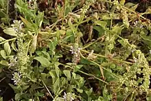 The inflorescences are 6-flowered clusters. On the flower, the calyx tube measures 4–5 mm (0.16–0.20 in) long, with the individual lobes measuring 2.5–3 mm (0.098–0.118 in) long. The corolla is a whitish, pale-pink to pink and is 8–9 mm (0.31–0.35 in) long. The corolla is labiate, with a small upper lip and a larger lower lip measuring 7.5–8.5 mm (0.30–0.33 in) long by 6–10 mm (0.24–0.39 in) wide.[2] The seeds are dark brown to black in color and measure 2 mm (0.079 in) by 1.5 mm (0.059 in).[3]