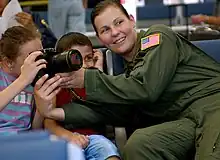 U.S. Air Force Staff Sgt. Stacy Pearsall, from the 1st Combat Camera Squadron, shows American children how to capture an image inside the terminal on Ramstein Air Base, Germany, July 22, 2006. The Air Force is flying American citizens who departed Lebanon to the United States. (U.S. Air Force photo by Tech. Sgt. Russell E. Cooley IV) (Released)