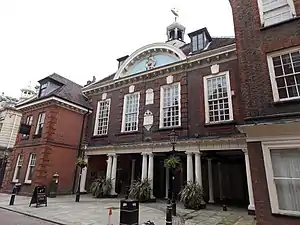 Rochester Guildhall: the lower of two white plaques above the doorway reads "These pavements were given by the Honourable Sir Stafford Fairbourne Anno Domini 1706"