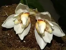 Stanhopea ecornuta is a species of orchid endemic to Central America (Belize, Costa Rica, El Salvador, Guatemala, Honduras, Nicaragua and Panama).