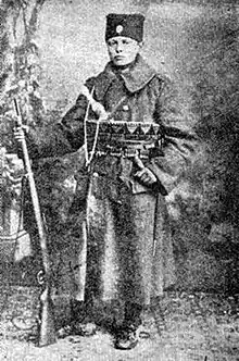 Not being able to enroll in the regular army, since he was only 17 years old, he joined the volunteer guard of Vojvoda Vuk, a Chetnik unit, in the war against the Ottoman Empire in 1912. The following year he was back on the frontline of the Serbian defence, this time against Bulgaria, where he was wounded near Kriva Palanka.[4] Together with the last class of cadets-corporals, he left the military academy in 1914 and went straight to the front to fight the Austro-Hungarian Empire. For much of 1914 he, much to his frustration, was assigned to Pirot which was far from the front.[5] In 1915 he participated in many battles, survived the Serbian army's retreat through Albania, and was one of the first who reached the top of the impregnable Kajmakčalan.[4] During these wars he was wounded seventeen times and was awarded eighteen times.[2] In 1937 Krakov became chief of Propaganda for Zbor thanks to Dimitrije Ljotić and subsequently, the editor-in-chief of the pro-Nazi Obnova newspaper, hailing from Belgrade.[6]