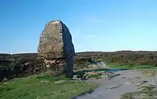 Several large, wind-eroded pillars of sandstone are found around the edge of Stanton Moor, and form significant features of its topography. From north, clockwise, these outcrops are the Duke of York Stone (in which the legend "Y 1826" is carved), the Cat Stone, the Duchess of Sutherland Stone, the Gorse Stone, the Heart Stone (9 metres high), the Cork Stone (5 metres high) and the Andle Stone.[2]