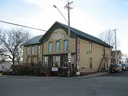 The building is two stories, frame covered with clapboards. Most of the windows have curved tops and the east gable is decorated with a bell-shaped fascia. The hall on the second floor had a stage.[3]