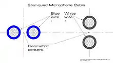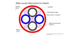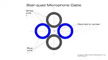 In electrical engineering, star-quad cable is a four-conductor electrical cable that has a special quadrupole geometry which provides magnetic immunity when used in a balanced line.[1] Four conductors are used to carry the two legs of the balanced line. All four conductors must be an equal distance from a common point (usually the center of the cable). The four conductors are arranged in a four-pointed star (forming a square). Opposite points of the star are connected together at each end of the cable to form each leg of the balanced circuit.