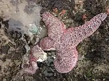 Sea star wasting disease or starfish wasting syndrome is a disease of starfish and several other echinoderms that appears sporadically, causing mass mortality of those affected.[1] There are approximately 40 species of sea stars that have been affected by this disease. At least 20 of these species were on the Northwestern coast of Mexico to Alaska.[2] The disease seems to be associated with increased water temperatures in some locales,[3][4] but not others.[5][6] It starts with the emergence of lesions, followed by body fragmentation and death.[7] In 2014 it was suggested that the disease is associated with a single-stranded DNA virus now known as the sea star-associated densovirus (SSaDV). [8] However, this hypothesis was refuted by recent research in 2018 and 2020.[9][10][11] Sea star wasting disease is still not fully understood.[7][12]