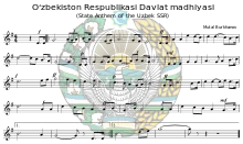 The State Anthem of the Republic of Uzbekistan (Uzbek: Oʻzbekiston Respublikasining Davlat Madhiyasi / Ўзбекистон Республикасининг Давлат Мадҳияси) uses the same melody as the anthem of the Uzbek Soviet Socialist Republic, composed by Mutal Burhonov in 1947, when the country was a republic of the Soviet Union. After Uzbekistan gained independence from the Soviet Union, new lyrics by Uzbek poet Abdulla Oripov were adopted.[1]