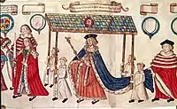 In due course, the heralds, who had the responsibility (under the Earl Marshal's direction) for marshalling the procession, began to keep detailed records of the event, the earliest of which dates from Henry VIII's first Opening of Parliament in 1510. The 1512 account includes an illustration of the Procession depicting participants together with their armorial bearings. It shows the Lords Spiritual at the front of the procession, accompanied by Heralds and Gentleman Ushers; the Serjeants-at-Arms follow with their maces, just ahead of Garter King of Arms. The King is preceded by the Cap of Maintenance, borne by the Lord High Constable and the Sword of State, borne by his son. The King himself carries a sceptre and walks beneath a richly-decorated canopy supported by four monks. His train-bearer is the Lord Great Chamberlain (carrying his white wand of office), who is 'assisted by' the Lord Chamberlain. The Lords Temporal follow, among whom can be seen the Lord Steward (with his white wand of office).