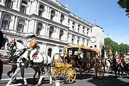 On the morning of the State Opening, the King and Queen travel 'in State' from Buckingham Palace to the Palace of Westminster, riding in a state coach and escorted by a Sovereign's Escort of the Household Cavalry.[4] Other carriages follow (namely the glass coach and three state landaus), conveying members of the Royal Household who will later take part in the State Procession.