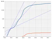 The linear plot shows the total number of cases as a function of time (by date) since 23 January 2020, the date of the first reported case in Singapore, while the graph plotted on a logarithmic scale, or a semi-log plot, shows an exponential growth in the number of cases as a straight line on the graph. In the logarithmic scale plot, the slope of the straight line determines the rate of growth of the number of cases, with a steeper slope representing a higher growth rate. The third and fourth plot shows the number of daily new cases and total active cases respectively as reported.