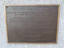 The statue rested on and was the central feature of the Portman Plaza on the south side of City Hall adjoining West Broad Street. The bronze alloy sculpture depicts Christopher Columbus wearing a cloak and holding a rolled document. The statue measures approximately 22 × 7.75 × 5.75 ft (6.7 × 2.36 × 1.75 m) and weighs approximately 312 tons.[2] It rested on a square stone base that measures approximately 63 ft.[3] A bronze plaque is infixed on the base.[4]
