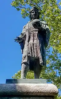 The statue was fabricated from heavy sheet copper by W. H. Mullins of Salem, Ohio in 1892.[1][2] The gift of Italian-Americans, the statue was installed in 1892 in Wooster Square.[3][4] An October 12, 1892 article in the New Haven Register described the time capsule that was placed under the statue: "The corner stone will hold a metallic box containing a number of coins and papers enclosed in a leathery case. There will be a written account of the proceedings of the day, together with a number of American, Italian, and Spanish coins.”[5]