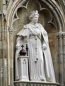 A statue of Queen Elizabeth II was unveiled at York Minster on 9 November 2022 by King Charles III, two months after the Queen's death in September 2022. The 6ft 7in (2m) tall sculpture was intended to mark the late monarch's Platinum Jubilee and was completed in August 2022, a month before her death.[1] The statue, which stands in a niche on the minster's west front and weighs almost two tonnes, is carved from French lepine limestone.[2] It portrays the Queen wearing her Garter robes and the George IV State Diadem, and holding the orb and sceptre, symbols of authority.[2] The design was chosen by the Queen.[1] The statue was originally to have been unveiled in September 2022, but this was postponed owing to the Queen's death and state funeral that month.[1]