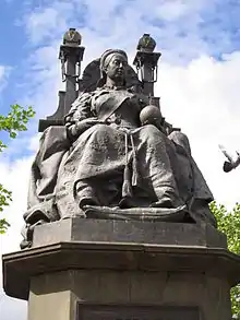 The statue consists of a figure in bronze on a base of granite and a pedestal of sandstone. The figure is about 3.2 metres (10.5 ft) high and the base and pedestal together are about 3.4 metres (11.2 ft) in height.[4] Queen Victoria sits on a throne, with the sceptre resting on her right forearm, and holding an orb in her left hand. The orb is decorated with a rose, to represent Lancashire.[lower-alpha 1] The queen is wearing a brocade dress with a sash, and a cloak. Her feet are resting on a cushion. The throne is in the Arts and Crafts style. Behind the queen's head is a laurel wreath, giving the appearance of a halo. Flanking the throne are two pillars, each surmounted by a capital in the form of attenuated oak trees.[lower-alpha 2] On top of the capitals are finials with carved harps on the fronts, to signify Ireland, and on the backs are lions rampart for Scotland. On the back of the throne is a statue of Saint George in armour, representing England.[5][6] Supporting the statue is a base and a pedestal, both square with canted angles, on a hexagonal step.[7] On the pedestal is a bronze plaque inscribed:[4]