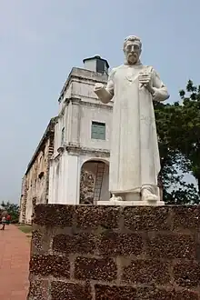 Statue of St. Francis Xavier standing in front of St. Paul's Church, Malacca, where he was temporarily buried after his death in 1553.