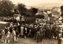 A replica of the bronze by MacDonald and Creswick, itself a Category B listed building,[12] was given to Ecclefechan, Carlyle's place of birth and burial, by Alexander Carlyle, husband of Mary Carlyle Aitken, the writer's niece, and unveiled on 3 September 1929 by the writer's granddaughter Betty Carlyle in the presence of 7,000 spectators.[13] Sir James Crichton-Browne delivered an address, transcribed in the 11 October 1929 issue of The Advertiser.[14] He referred to Carlyle as not merely "a great master of literature" but "our supreme historian", "an earnest social reformer", and, "in short, a man of genius of the colossal type".