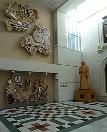 The City's plan to display the wooden replica in the atrium of Ventura City Hall was met with objections from the city art committee and the Candelaria American Indian Council. Members of the art committee felt the statue was too large and not harmonious with the design of the atrium. The City had already commissioned through the art committee a series of murals reproducing local Chumash petroglyphs in the atrium. The Indian Council objected due to Father Serra's alleged abuse and enslavement of the Chumash people. Jessica M. Roybal, the executive director of the Indian Council, said “What a slap in the face to the Indian people.”[32] Members of the Padre Serra Parish in nearby Camarillo offered to display the wooden statue in a place of honor but were turned down.[20] The wooden Serra statue was placed in a corner of the atrium with explanatory plaques.[32][26]
