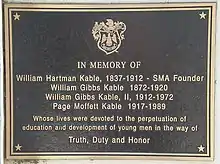 Plaque at Kable Hall honoring Staunton Military Academy's founding family
