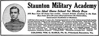 Kable's son William G. Kable was completing his studies at the academy as the troubles were just beginning. After graduating with honors in 1890, he went off to work for a year in Cincinnati, completed business college in Baltimore, taught for two years at the academy, and then worked for several major firms in New York City. The younger Kable finally returned to Staunton in 1898 to become a Mathematics and Languages instructor and was promoted to Commandant in 1900 with responsibility for managing the academy's operations. He was joined by another key figure in the school's development, Thomas Russell. A graduate of The Citadel military college in South Carolina, Russell had distinguished himself as a cadet and after graduation became Commandant at Horner Military Academy in North Carolina. In 1904, he was invited to come to Staunton as Headmaster.[4] Meanwhile, Captain Kable, as the father was known (he had been a Captain and a Quartermaster during the Civil War), served as President.