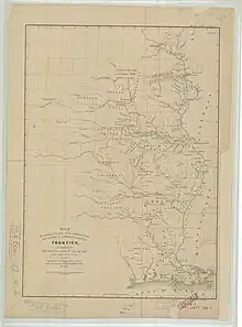 "Map Illustrating the Plan of the Defenses of the Western and Southwestern Frontier" published 1837, showing west Mississippi, Baton Rouge, and the Arkansas River and approximate indigenous territories at that time (NARA 77452208)