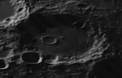Stefan is a lunar impact crater on the far side of the Moon, just beyond the northwestern limb. Attached to the western rim is the slightly smaller crater Wegener, and close to the eastern rim is Rynin.