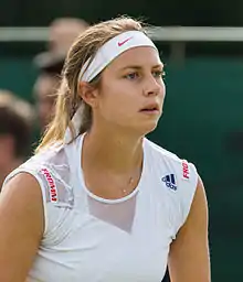 Vögele then played at the Gastein Ladies where she defeated Julia Görges 7–6, 6–2 in the first round.[58] In the second, she upset fifth seed Elina Svitolina, 6–2, 7–5.[59] In the quarterfinals, she lost to fourth seed and eventual champion Andrea Petkovic.[60] At the İstanbul Cup, Vögele defeated Tsvetana Pironkova in the first round 6–4, 7–5. In the second, she lost this time to fourth seed Svitolina, 0–6, 3–6.[61] At the Baku Cup, Vögele defeated Alexandra Cadanţu in the first round 6–1, 6–4. In the second round, she upset top seed Sorana Cîrstea 6–1, 6–1.[62] In the quarterfinals, she won against last year finalist Shahar Pe'er 6–2, 2–6, 6–4 to reach her first semifinal of the year. In the semifinals, she lost to fifth seed and eventual finalist Bojana Jovanovski in three sets.[63]
