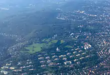 Aerial view of the hospital and church and the surrounding park area of Steinhof in the lower half of the picture