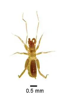 Stenochrus portoricensis is a species of arachnid belonging to the family Hubbardiidae in the order Schizomida, which are commonly known as short-tailed whip scorpions.[1][2][3] They are mostly found in North and Central America, but their parthenogenetic lifestyle allows them to live in other parts of the world in temperate climates.[4][5][6] They are able to thrive in different parts of the world, especially in caves, forests, fallen logs, and abandoned nests of termites.[7]
