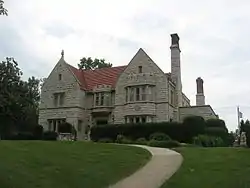 Built of limestone with a limestone foundation, the Tudor Revival house is covered with a slate roof. Two and a half stories tall, the house features an irregular plan, with battlement-topped bay windows in assorted gables, tall chimneys, and a porte-cochère sheltering the main entrance.[4] The windows are sheltered by hoodmolds, and the upper and lower sections of the facade are separated by a stone belt course. Decorative elements in the upper part of the house include a pair of gargoyles atop the roof and the ornamental chimney pots atop the chimneys. Extensive wooden panelling beautifies the interiors, which feature ornamental ceilings and marble fireplaces.[3] Upon its completion, the house possessed its own pipe organ, made by W.W. Kimball of Chicago.[5] The entire house has an area of 5,400 square feet (500 m2).[3]
