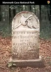 Bishop was buried on the south hill above the cave in what became known as "The Old Guides' Cemetery." After Stephen Bishop died, his widow Charlotte Brown Bishop married cave guide Nick Bransford,[15] who served as a guide at Mammoth for over 50 years, until Bransford died in 1895.[19] Harold Meloy, writing about Bishop in the book Cavers, Caves, & Caving states that "Pittsburgh millionaire James R. Mellon" visited the cave for one week in November 1878, where he heard stories of Bishop and met Charlotte, who then managed the hotel dining room. She led him to Stephen's gravesite, "which had only a cedar tree to mark it." Mellon promised to have a headstone carved for Stephen's grave. Three years later, Mellon arranged for a monument carver to prepare a second-hand tombstone, one that a Civil War soldier's family had not paid for (hence the appearance of a sword and flag in the lunette). The stone mason chiseled off the original name and placed an inscription that read,[20]