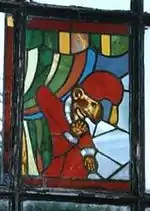 A stained glass image of Mr Punch by Steve Ignorant displayed at Dial House, Essex