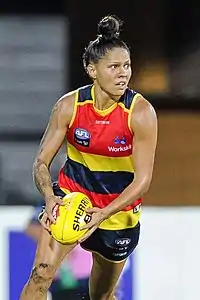 Thompson was drafted by Adelaide with their fourteenth selection and 106th overall in the 2016 AFL Women's draft.[5] She made her debut in the 36-point win against Greater Western Sydney at Thebarton Oval in the opening round of the 2017 season.[6] She was a part of Adelaide's premiership side after the club defeated Brisbane by six points at Metricon Stadium in the AFL Women's Grand Final.[7][8] She played every match in her debut season to finish with eight matches.[9] At the end of 2017, Thompson represented the Allies in the AFLW State of Origin match.[10] Adelaide signed Thompson for the 2018 season during the trade period in May 2017.[11] After living and training in Darwin during her first season, Thompson relocated to Adelaide from the 2018 season.[12] The 2019 season was very successful for Thompson. Following a switch from playing as a defender to playing as a forward, she was Adelaide's leading goalkicker and the league's leading goalkicker after kicking 13 goals in the regular season.[13] She also kicked a goal for Adelaide as they claimed their second premiership, beating Carlton at Adelaide Oval in the 2019 Grand Final.[14] After the season, Thompson was selected for the 2019 AFL Women's All-Australian team.[15]