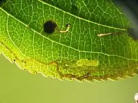 The larvae feed on Rhamnus catharticus. They mine the leaves of their host plant. The mine consists of a full depth corridor, beginning at an under-surface egg shell. The corridor makes several sharp turns, so much so that the loops almost touch. The last section of the corridor is significantly wider. Pupation takes place outside of the mine.