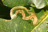 The larvae feed on Quercus cerris, Quercus petraea, Quercus pubescens and Quercus robur. They mine the leaves of their host plant. The mine initially consists of a narrow corridor with a thin frass line, soon widening into a fairly long, broad corridor with a largely broad frass line. Mostly, the first part of the mine follows the leaf margin, entering the centre of the leaf after a sharp turn.