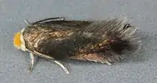 The wingspan is 4.5–6 mm. The thick erect hairs on the head vertex are black in the male, orange yellow in the female and the collar is black in both sexes Antennal eyecaps are yellow- white. The front wings are dark bronze brown with a weak metallic luster. Hindwings are grey.
