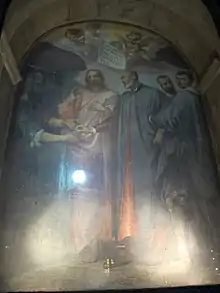 In 1304 the prison's first inmates were Ghibellines taken in the capture of Stinche Castle, a Cavalcanti family stronghold near Greve in Chianti.[1] The prison went on mainly to house prisoners of war and political prisoners. Most of Walter VI, Count of Brienne's political enemies were held there and the city's inhabitants stormed the prison. Orcagna was commissioned to paint a fresco of the event in the prison courtyard, entitled The Fall of the Duke of Athens, in which saint Anne gives the Florentines the banners of the arts but an evil angel chases Walter from the city - the fresco is now in the museum in Palazzo Vecchio. Prisoners were led along the via Ghibellina to the execution site near Torre della Zecca. Tabernacles were set up along the route to comfort the condemned prisoners, such as the 'Tabernacolo delle Stinche' painted in 1616 by Giovanni da San Giovanni and remodelled in the 19th century by the architect Luigi Cambray-Digny. It may be that The Stinche was the subject of Sassetta's painting "The Blessed Ranieri Rasini Delivering the Poor from the Prison in Florence. The building is very similar in appearance and it appears to be the same location. This painting had been a predella panel of the polyptych of San Francesco de Borgo San Sepolcro, 1437-44 (oil on panel). Sassetta (Stefano di Giovanni di Consolo) (c.1392-1450) / Italian, and originality part of Saint Francis Altarpiece. Currently in the Louvre Department of Paintings, Denon, 1st floor, room 4 .