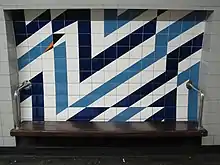 The station was expanded to accommodate the Victoria line, whose extension from Victoria to Brixton opened on 23 July 1971.[14] Parallel cross-platform interchanges were provided between the two lines in both directions and the 1920s surface buildings were replaced by a modern structure.[15] A third escalator was added to the existing pair, by constructing an additional shaft. Some construction work disturbed shelter tunnels constructed during war, that had to be re-sited.[16] A British Transport Police (BTP) station was later built above the station in 1985, as part of a BTP initiative to increase police presence across the Underground.[17] The Victoria line platforms have tiling designed by Abram Games showing a swan, a reference to the nearby Swan public house.[18]
