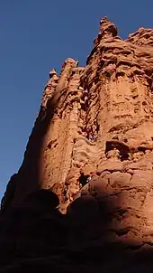 The Stolen Chimney is a traditional multi-pitch climbing route located on the Ancient Arts tower of one of the Fisher Towers. This is the most common routes used to ascend the "corkscrew" summit of the tower (the final fourth pitch). The corkscrew summit is the westernmost summit of the Ancient Arts tower but it is not the tallest. The summit is noteworthy for its unusual shape which makes the climbing experience very different from most other climbs. The unusual shape is also visually striking. Photographs of the corkscrew summit have been extensively published in many settings including mainstream advertisements.[1][2][3]