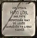 HERE LIVED HUGO LÖBL BORN 1875 DEPORTED 1942 TO ŁÓDŹ MURDERED 19.2.1942 IBIDEM |