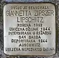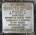 HERE LIVED GIANNETTA ZIPSZER LIPSCHITZ BORN 1893 ARRESTED MARCH 1944 INTERNED IN RISIERA DI SAN SABBA DEPORTED 1944 AUSCHWITZ MURDERED AT AN UNKNOWN DATE |