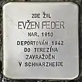 HERE LIVED EVŽEN FEDER BORN 1910 DEPORTED 1942 TO THERESIENSTADT MURDERED IN SCHWARZHEIDE |