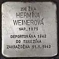 HERE LIVED HERMÍNA WEINEROVÁ BORN 1875 DEPORTED 1942 TO THERESIENSTADT MURDERED 11.1.1943 |