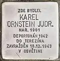 HERE LIVED DR. JUR. KAREL ORNSTEIN BORN 1901 DEPORTED 1942 TO THERESIENSTADT MURDERED 18.12.1943 IN AUSCHWITZ |