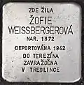 Žofie Weissbergerová was born on 28 April 1872. She lived in the same building as Hermína Weinerová. On 13 June 1942, she and Weinerová were arrested and deported from Kolín to Theresienstadt concentration camp with transport AAd. Her transport number was 80 of 736. Hermína Weinerová was brought to death there by the Nazi regime on 15 October 1942, according to the death certificate of the Nazi doctors. On the same day, Žofie Weissbergerová was deported to Treblinka extermination camp with transport Bv. Her transport number was 1250 of 2,000. Not one Jew from this transport survived the Shoah.[80][81] |