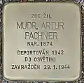 HERE LIVED MUDR. ARTUR PACHNER BORN 1874 DEPORTED 1942 TO AUSCHWITZ MURDERED 29.1.1944 |