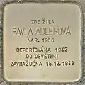 HERE LIVED PAVLA ADLEROVÁ BORN 1906 DEPORTED 1942 TO AUSCHWITZ MURDERED 15.12.1943 |