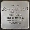 HERE LIVED JIŘINA PFEFFEROVÁ BORN 1941 DEPORTED 1942 TO THERESIENSTADT 1944 TO AUSCHWITZ MURDERED |