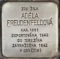 HERE LIVED ADÉLA FREUDENFELDOVÁ BORN 1881 DEPORTED 1942 TO THERESIENSTADT MURDERED 1942 IN AUSCHWITZ |